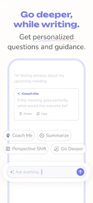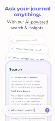 Transform your writing into a conversation. Our intelligent AI journal companion offers personalized daily prompts and real-time insights to help you explore your inner world. Go beyond simple search—ask your entire private diary questions about your past to uncover hidden patterns in your mental health journey. Synthesize jumbled thoughts into concise ideas and find the clarity you've been looking for.