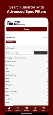 The Machinery Trader app features convenient search tools that allow you to filter listings by category, make, model, location, condition, and various other specs, from horsepower to hours used, to find what you need fast.