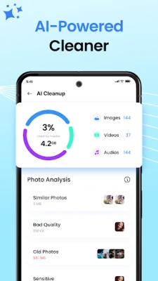 Our intelligent AI Cache Cleaner helps you scan your device to find and clear junk files, cache, and unnecessary data. AI Cleanup identifies duplicate photos, similar images, blurry or low-quality pictures, old screenshots, and large files taking up storage. With just a tap, you can sort, review, and clean your phone easily.