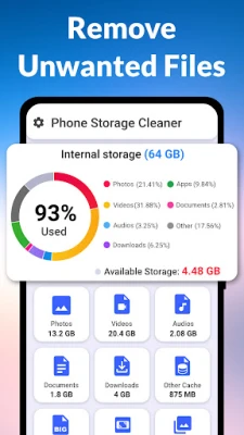 With Phone Storage Cleaner, you get an overview of your storage. The app categorizes your files into different sections, allowing you to browse and delete unnecessary files with ease.