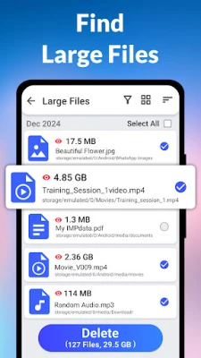Phone Storage Cleaner helps users identify large files that take up more space. The app finds and displays a list of the large files, allowing users to review them and decide what to keep or delete.